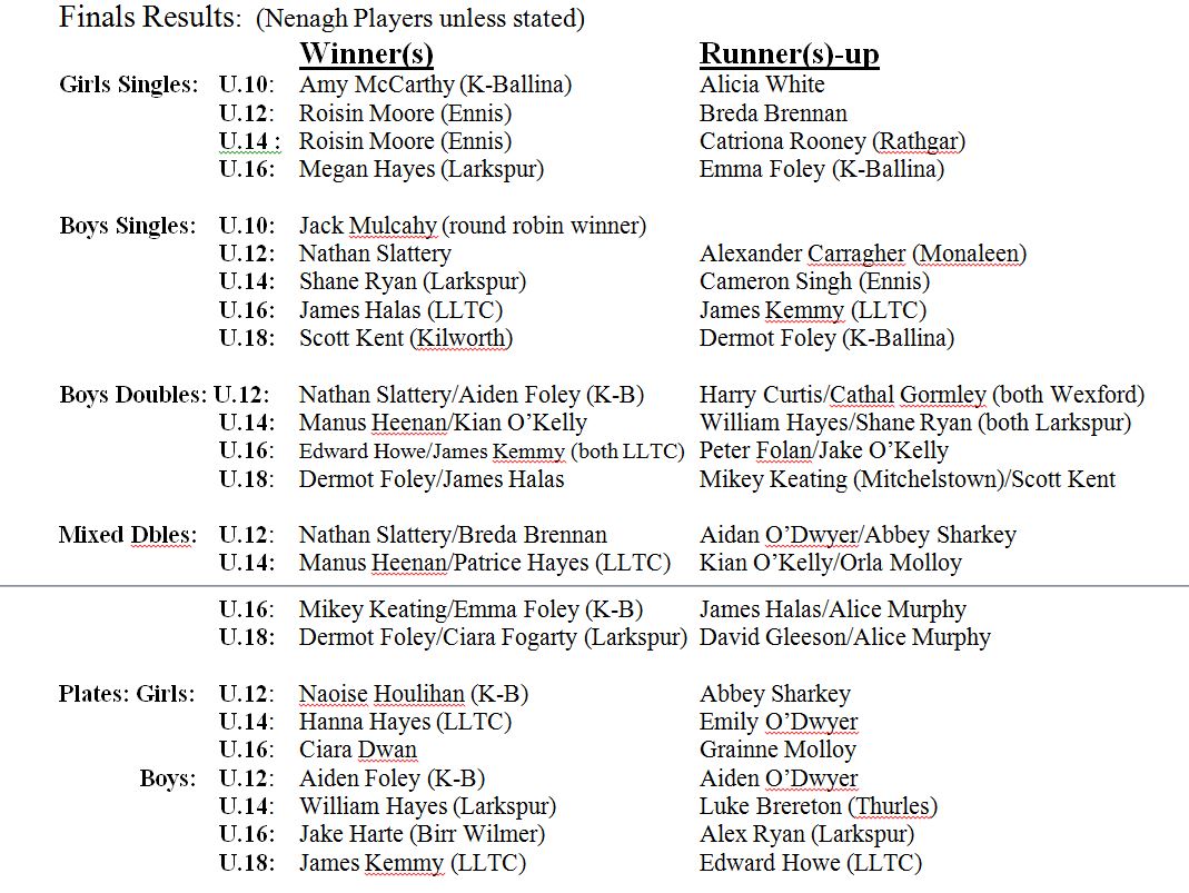 Among the more prominent players, Nenagh’s Nathan Slattery was very much to the fore. Nathan had a great tournament winning all three u.12 events, singles, doubles (with Aiden Foley) and mixed (with Breda Brennan).